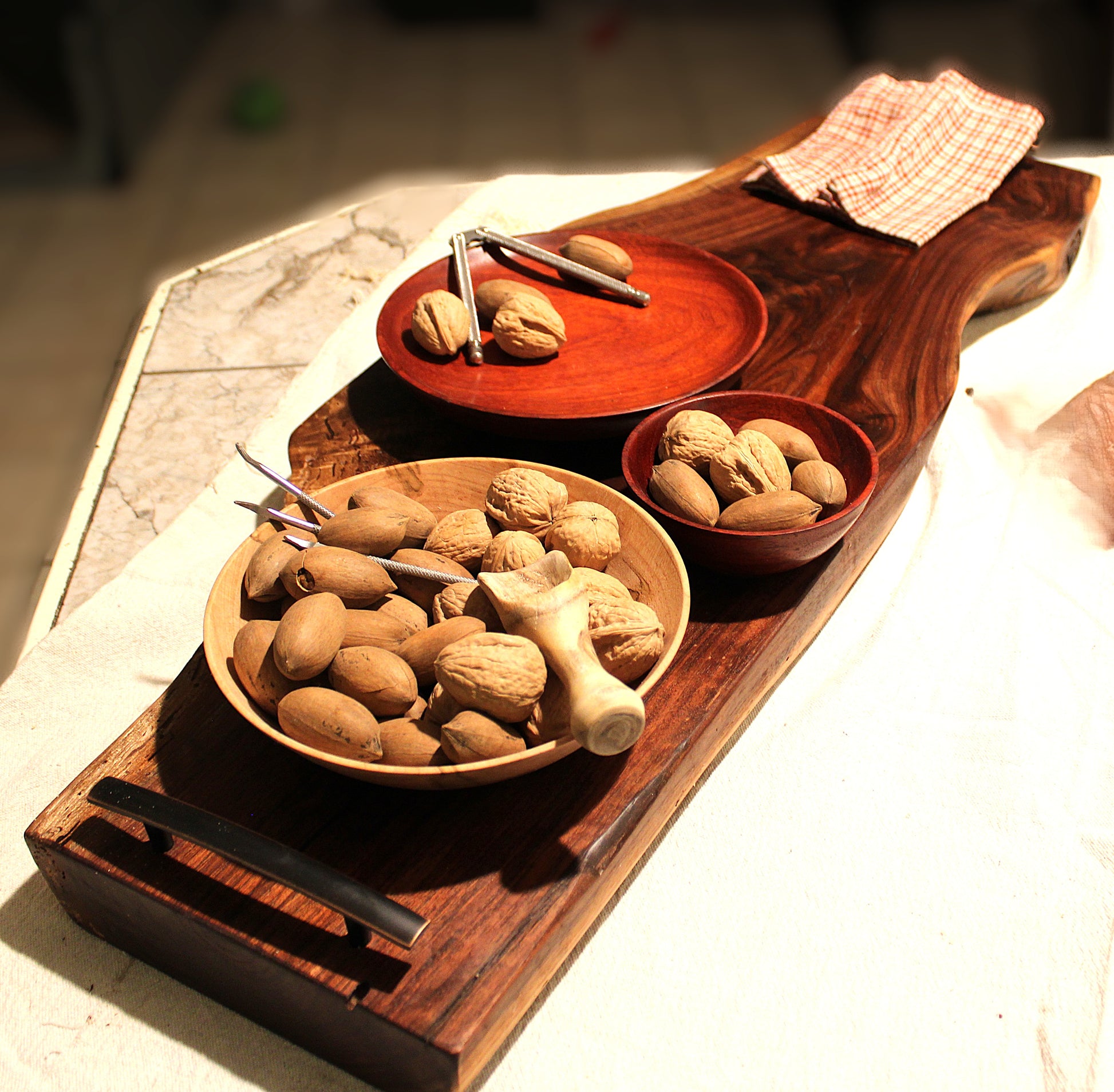 The walnut was shaped and finished to highlight every ripple in the grain. The edges follow the natural curve of the wood with two live edges, and the dark metal handles give it weight and presence. This is the piece that stays out on the counter all year—not just when guests show up. The weight, thickness, and grain movement make it a functional piece of art as much as a serving tray.