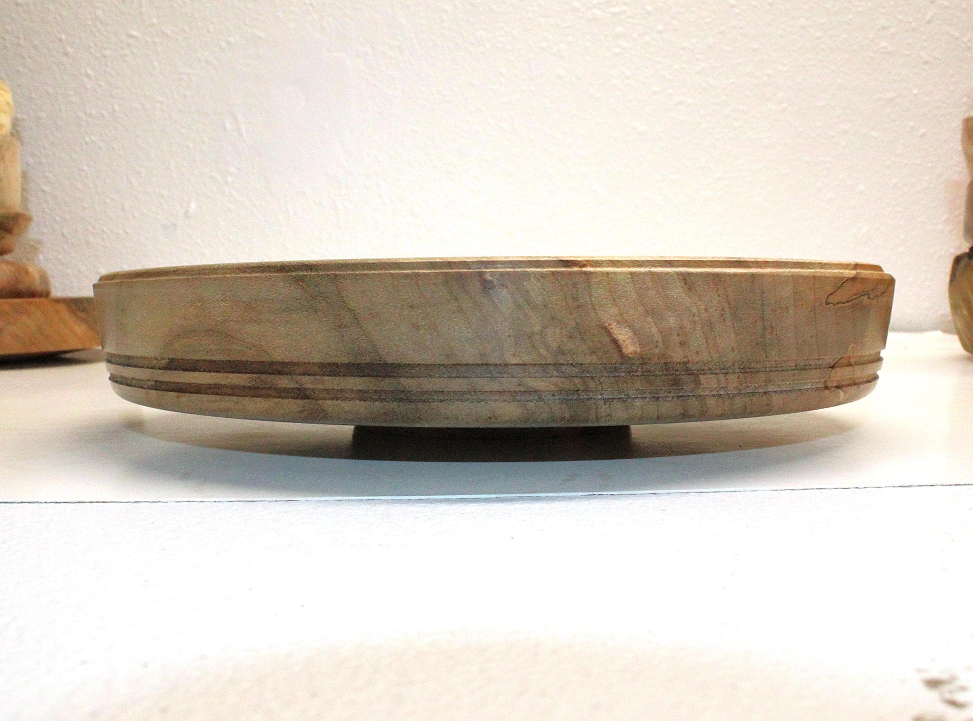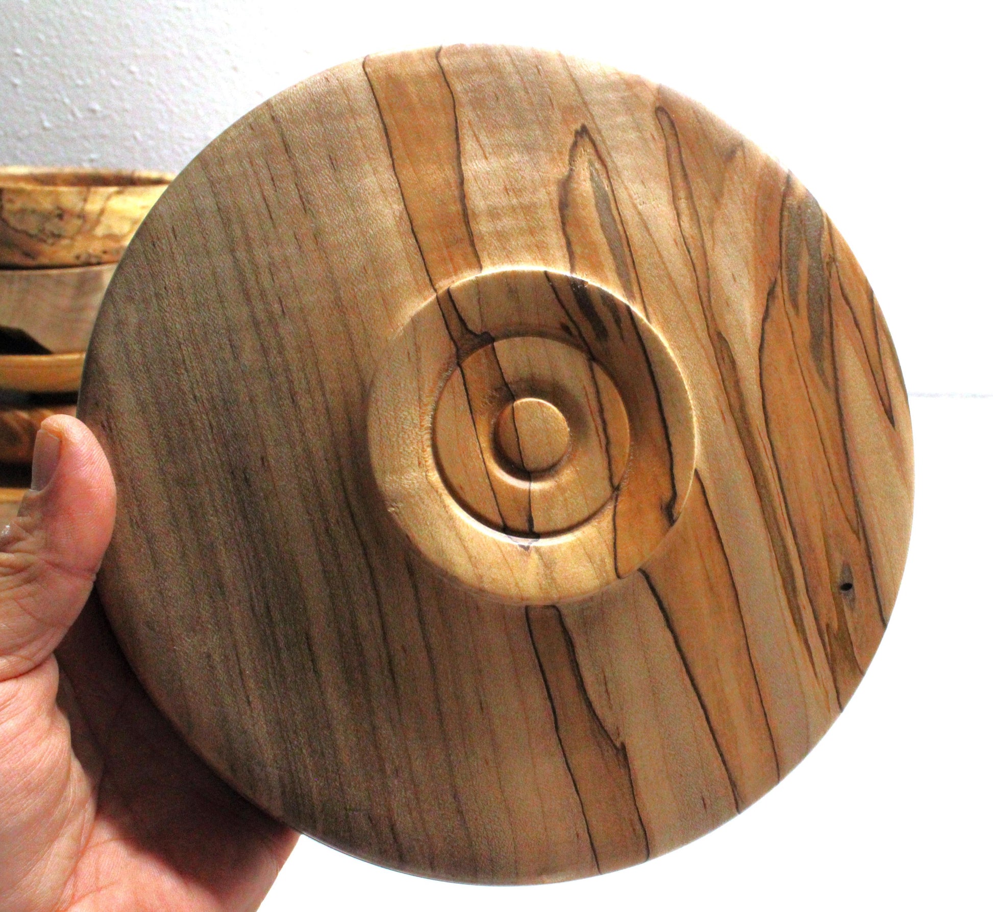 This ambrosia maple bowl has unique spalting that is distinct and non-contiguous. The contrast of the darker colors against the lighter natural maple make for a striking dish, capable of being a centerpiece decor item or great, one of a kind gift.