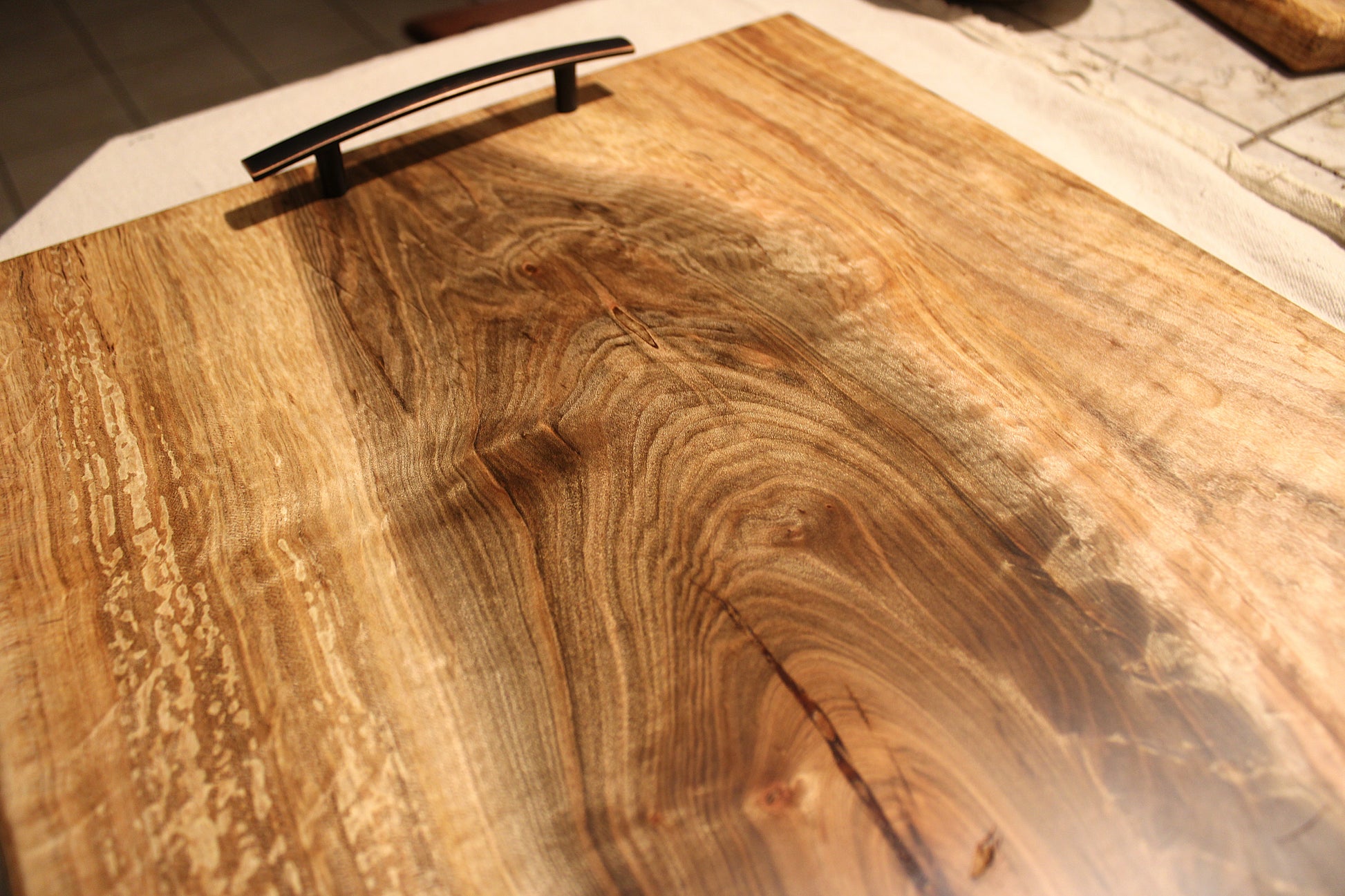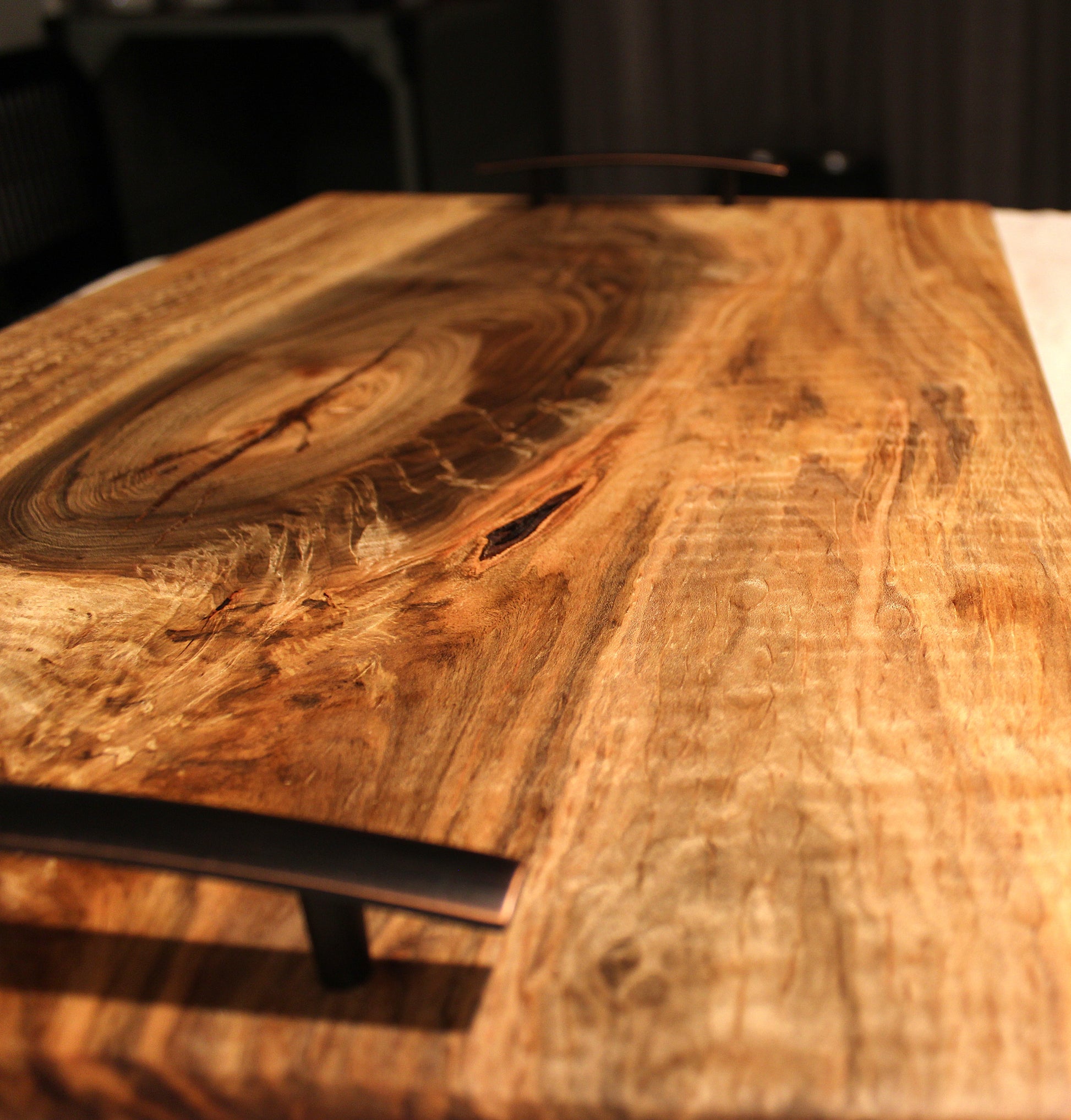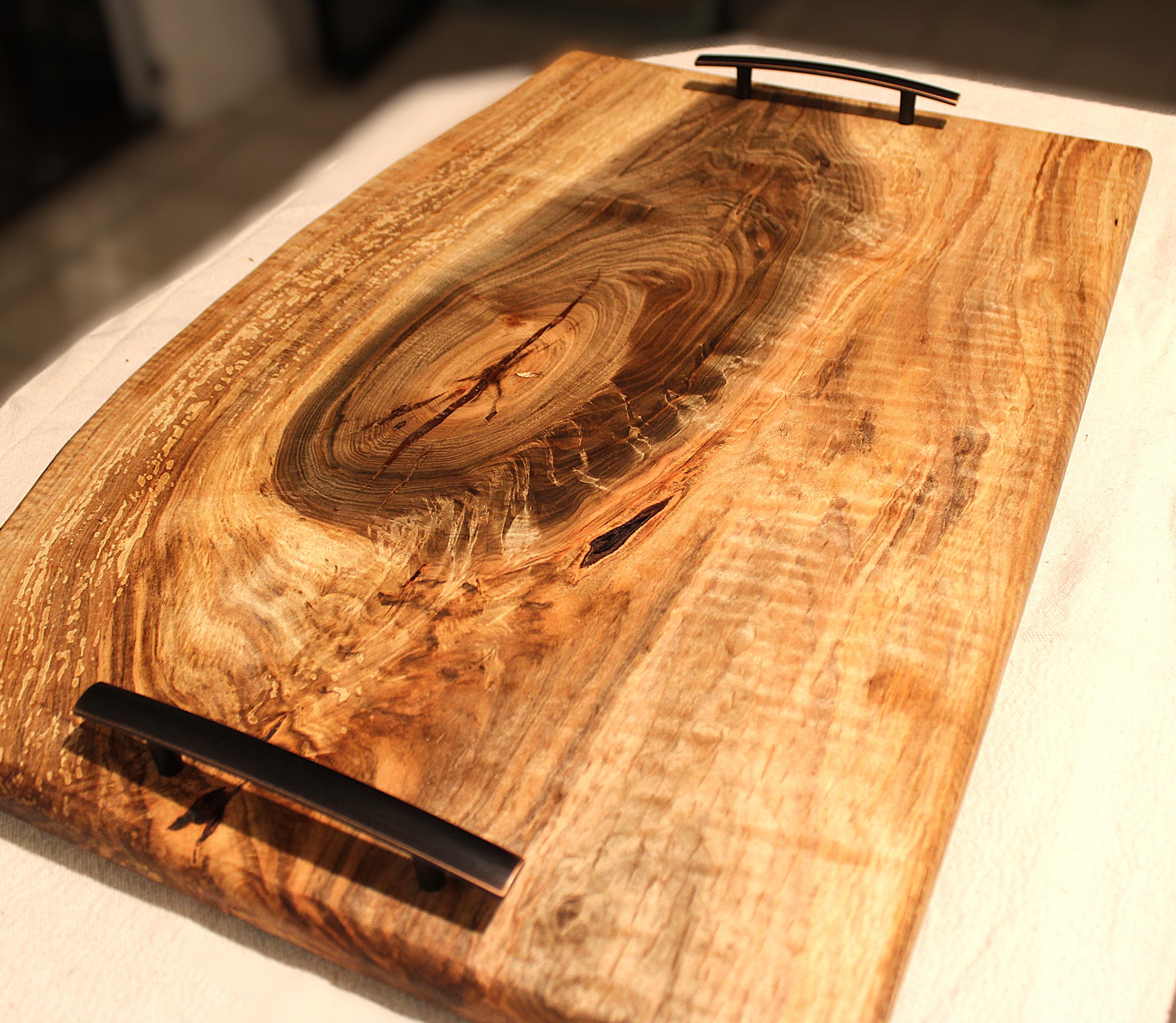 This board is cut from a single slab of spalted maple and shaped by hand to follow the natural curves of the grain. It isn’t milled flat or forced into symmetry—its edges and flow are the original lines of the tree. The spalting and figuring are completely natural and completely one-of-a-kind. When light hits it, you see the movement in the grain like ripples in water.